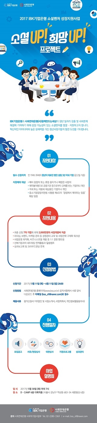 IBK기업은행은 이번 사업과 관련해 청년실업과 사회문제에 대한 창의적 해결을 위해 사업을 지원하게 됐다며 소셜벤처의 지속가능성 확보를 통해 청년층의 일자리를 창출할 수 있을 것이라고 기대감을 밝혔다.