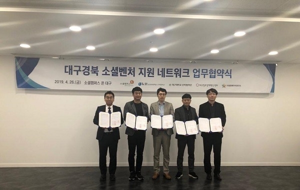 대구창조경제혁신센터는 26일(금) 오후 금오공과대학교 산학협력단, 대구대학교 산학협력단, (사)공동체디자인연구소, 사회적 기업 성장지원센터와 대구경북지역 소셜벤처 발굴과 성장을 위한 지원 생태계를 구축하기 위해 업무협약을 체결하였다.
