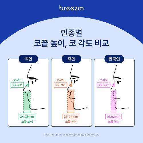 한국인과 백인의 평균 데이터로 비교하면, 한국인의 얼굴과 광대 너비는 백인보다 각각 6mm, 7mm 넓었으나 코끝 높이는 4mm 낮았다. 코 각도 역시 6도가량 낮았다.
