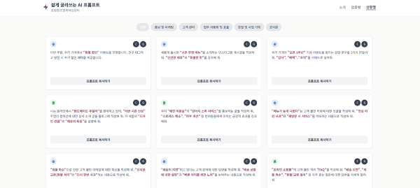 함께 공개된 AI 프롬프트 빌더는 입력 목적(예: 제품 또는 서비스 소개, SNS 홍보글, 보도자료 작성 등)을 선택하면 최적화된 문장 구조와 명령어를 제시해 주는 형태로 구성됐다.