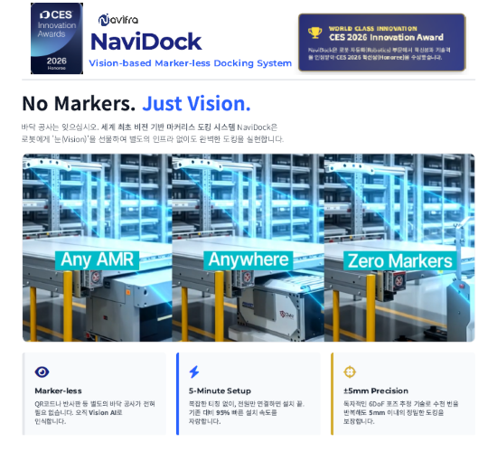 자율주행 로봇 솔루션 기업 나비프라(Navifra)가 비전 기반 마커리스 도킹 시스템 ‘나비독(NaviDock)’으로 CES 2026 로봇 자동화 부문 혁신상을 수상했다고 23일 밝혔다. 별도의 인프라 설치 없이 비전 인식만으로 정밀 도킹을 수행하는 기술적 차별성을 인정받은 결과다.