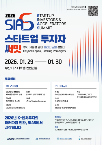 초기투자액셀러레이터협회, 부산서 ‘2026 스타트업 투자자 서밋’ 개최 초기투자액셀러레이터협회(KAIA)가 1월 29일부터 이틀간 부산에서 ‘2026 스타트업 투자자 서밋’을 개최한다. 이번 서밋은 ‘Beyond Capital, Shaking Paradigms’를 부제로, 자본 중심을 넘어 민간 주도의 새로운 투자 생태계 방향을 모색한다. 행사는 액셀러레이터 도입 10년을 맞아 패러다임 변화, LIPS 인베스터 스케일업, AI 기반 투자 기술 등 5대 핵심 아젠다를 다룬다. 단순 자금 공급을 넘어 지식과 네트워크 기반의 지속 가능한 투자 구조를 만드는 해법을 심층적으로 논의할 예정이다. KAIA는 이번 행사를 통해 액셀러레이터를 생태계의 ‘설계자이자 연결자’로 재정의하고, 민간 주도의 자생적 투자 환경을 공고히 할 계획이다. 특히 부산을 거점으로 지역과 글로벌을 잇는 크로스보더 논의의 장이 될 것으로 기대를 모으고 있다.