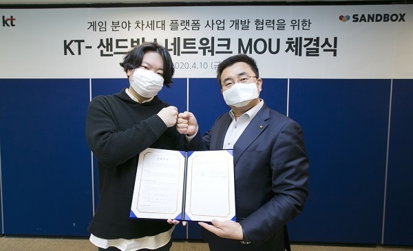 샌드박스와 KT는 지난 10일 오후, 서울 강남구에 소재한 샌드박스 본사에서 샌드박스 이필성 대표와 KT 미디어 플랫폼 사업본부의 송재호 전무 등이 참석한 가운데 게임 분야의 차세대 플랫폼 사업 개발 협력을 위한 샌드박스-KT 업무 협약식을 진행했다.