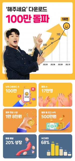 하이퍼로컬이 운영하는 심부름 앱 ‘해주세요’가 출시 16개월 만에 누적 다운로드 100만을 돌파했다고 27일 밝혔다.